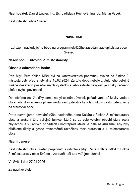 Odvolání druhého místostarosty obce Světec